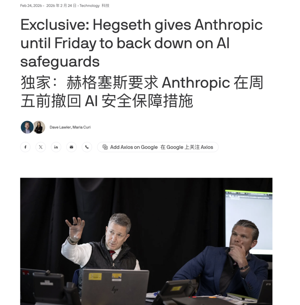 2月27日下午5:01前,必须移除所有限制条款,否则终止合同、援引《国防生产法》强制执行,或直接把Anthropic列为供应链风险。