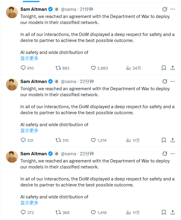 而就在刚刚,Sam Altman在X上发布了一则声明,宣布与五角大楼达成了合作。