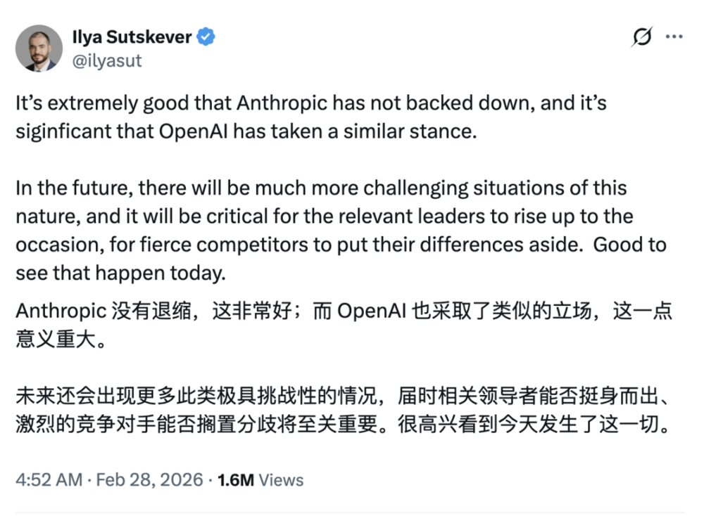 Ilya作为对超级智能安全有极端执念的人,这条帖子被视为行业安全派的一次罕见团结信号。