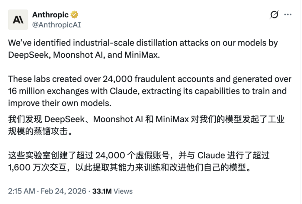 Anthropic突然在官网和X上高调发布了一份措辞激烈的声明,指控中国头部大模型公司MiniMax、DeepSeek等对Claude进行了工业级规模的非法蒸馏(industrial-scale illegal distillation)。
