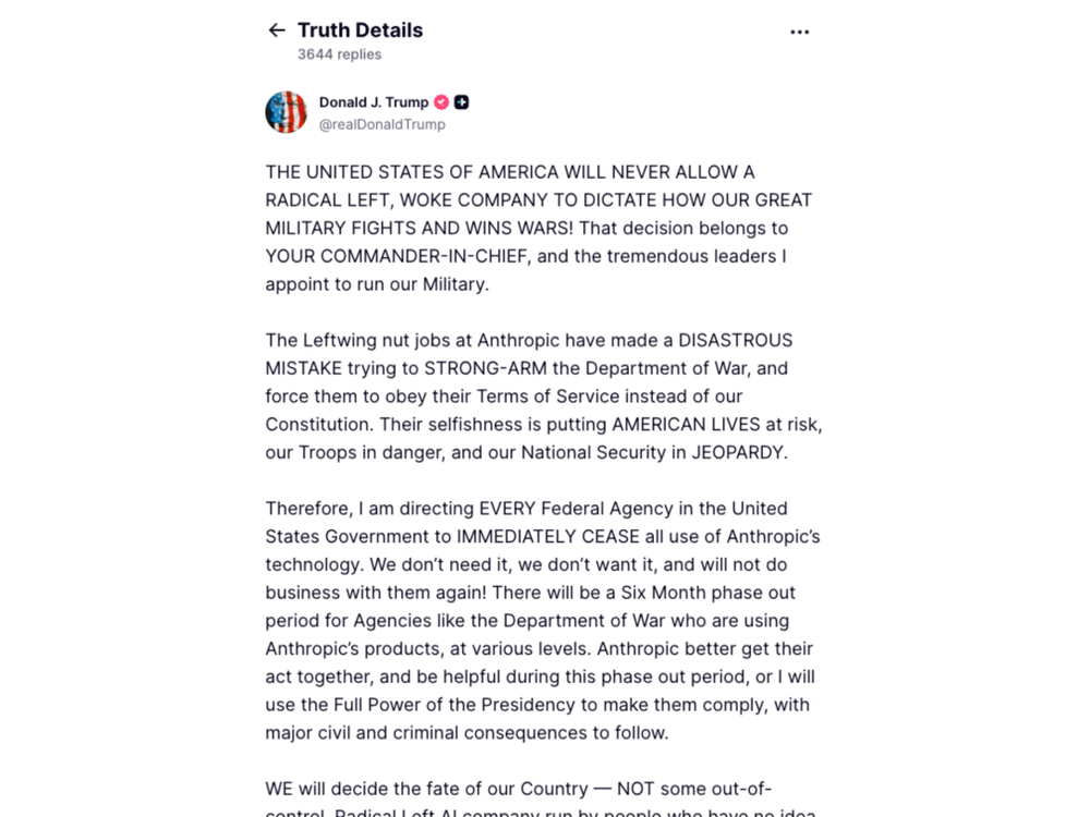 特朗普在帖文中怒吼:Anthropic里的左翼疯子试图对战争部施压,强迫他们遵守公司服务条款而不是美国宪法,这是一个灾难性的错误……因此,我指示美国政府的每一个联邦机构,立即停止使用Anthropic的所有技术……对于像战争部这样在使用Anthropic产品的机构,将给予六个月过渡期。
